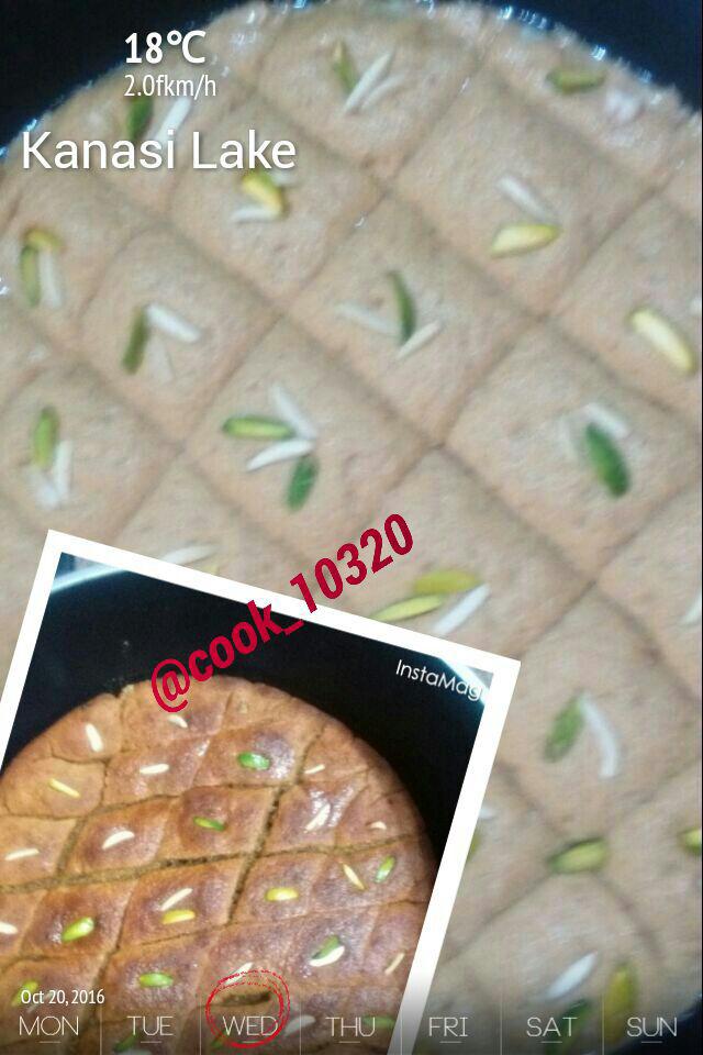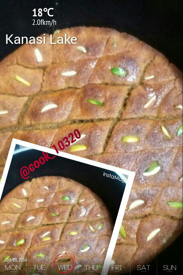 مقداری اب وشکر را مخلوط میکنیم بعد هل وزنجبیل وزعفران رو میریزیم و بعد مایه خمیر و ارد ها رو اضافه میکنیم، کم کم آب اضافه میکنیم تا زمانی که خمیر بدست نچسبه و ورز میدهیم تا خمیر لطیفی حاصل شه، وقتی خمیر بدست آمد روشو با نایلون میپوشونیم و استراحت میدیم تا حجم خمیر دو برابر شه، بعد که خمیر ور اومد کف ظرف رو چرب میکنیم و یک لایه خمیر پهن شده رو کف ظرف میزاریم.خرما را، از قبل هسته ان را در میاریم و میچینیم روی خمیر بامغز گردو و پسته خورد شده، بعد یه لایه خمیر پهن میکنیم و میزاریم روش، و برش میزنیم،و روی برش ها روغن میریزیم، میزاریم داخل فر 180درجه به مدت ۲۰دقیقه، بعد با خلال دندون تست میکنیم اگر چیزی بهش نچسبید گریل را روشن می کنیم تا روی کماچ سرخ شه.